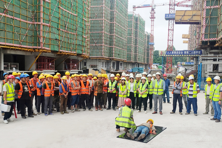 隨后進(jìn)行的高處墜落應(yīng)急演練環(huán)節(jié),負(fù)責(zé)人講解了高處墜落事故發(fā)生后如何開展緊急救援,并現(xiàn)場(chǎng)演示了警戒、報(bào)告、處置的過程,讓管理及施工人員對(duì)應(yīng)急處置流程有了更加詳細(xì)的了解。