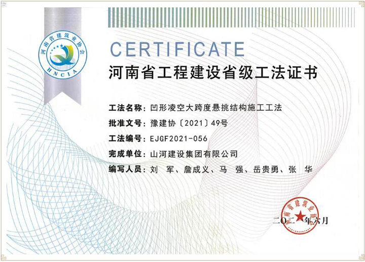 近日,河南省建筑業(yè)協(xié)會公布了《2021年度第一批河南省省級工法名單》,山河建設集團河南公司申報的《凹形凌空大跨度懸挑結構施工工法》成功入選,被認定為河南省工程建設省級工法。